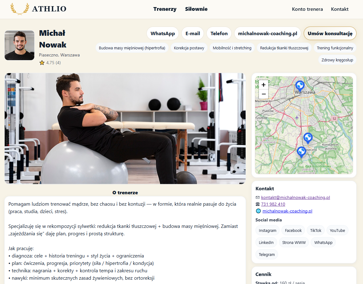 Athlio to wyszukiwarka siłowni i trenerów. Klient szuka w swojej okolicy → trafia na Twój profil. Prosto: lepsza widoczność + opinie + szybki kontakt.