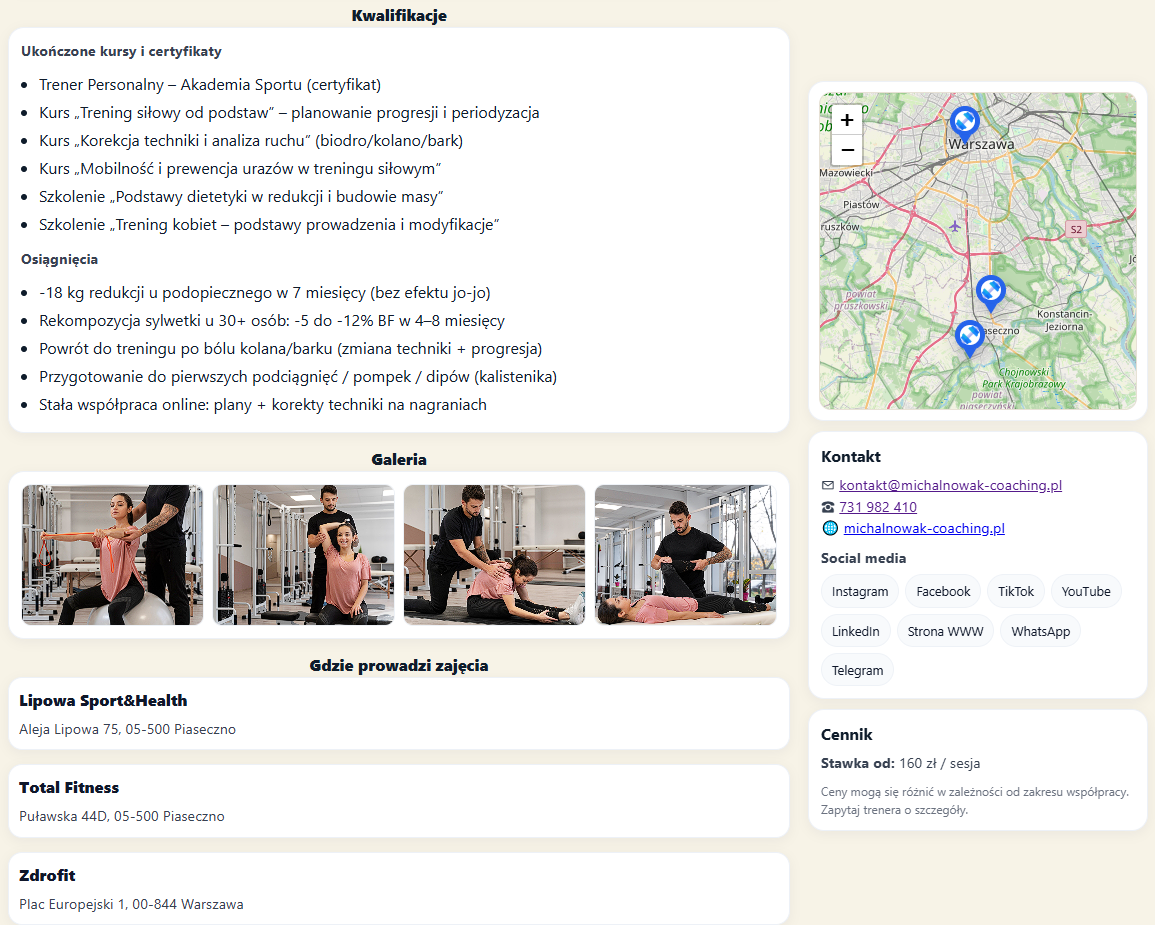- Profil jak wizytówka – specjalizacje, cena od, opis, linki, siłownie.